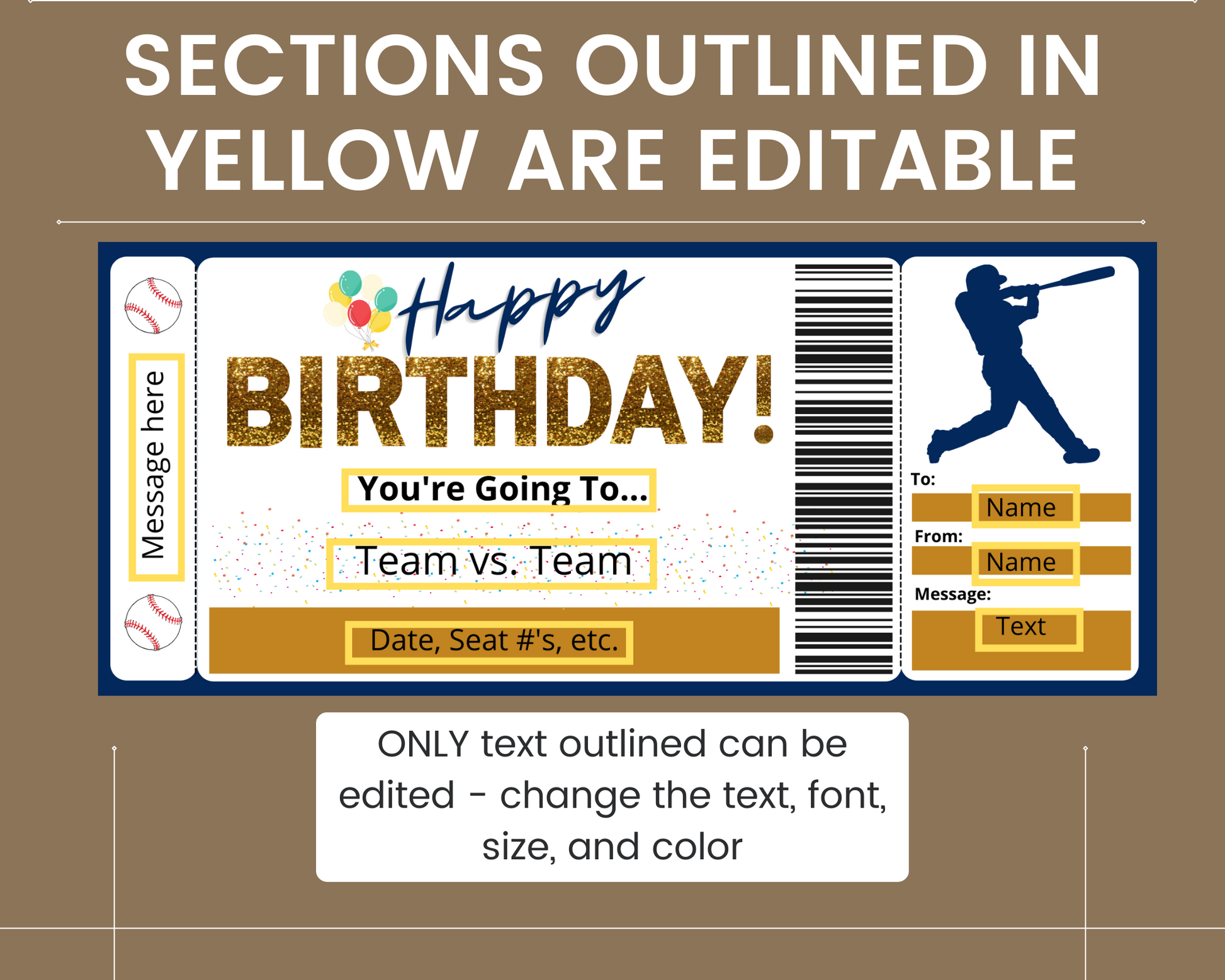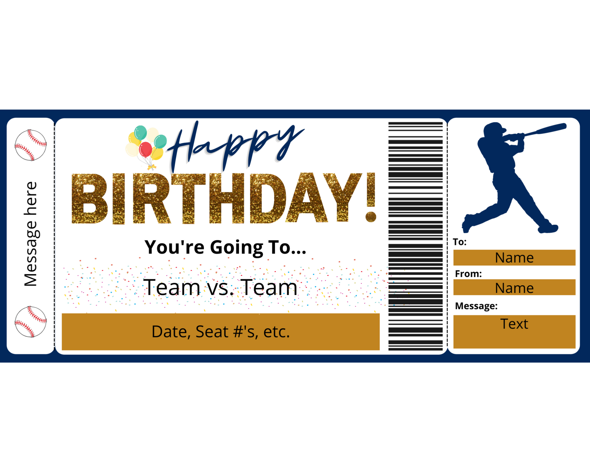 Birthday baseball game ticket template. The perfect way to surprise someone with baseball game tickets for their birthday!