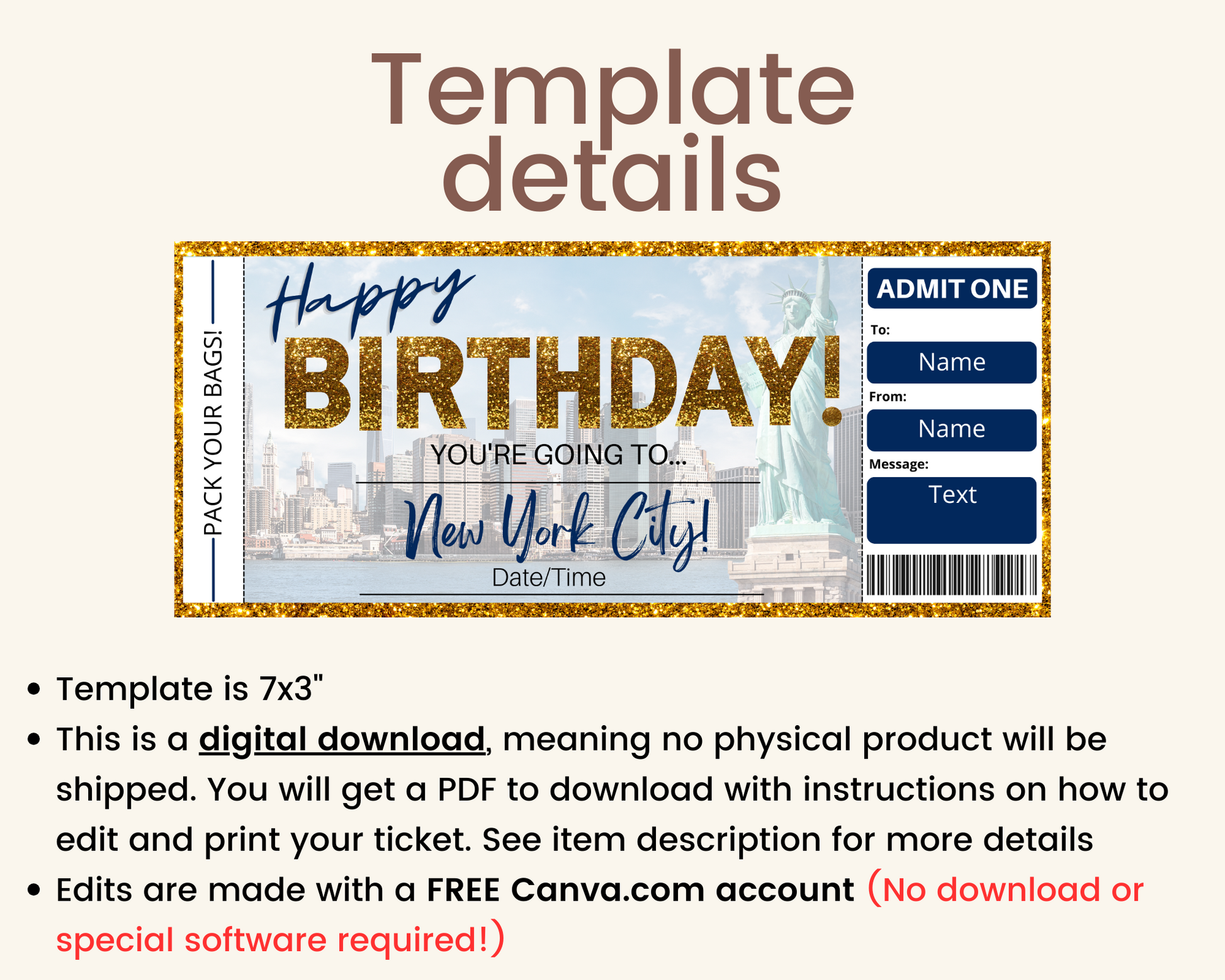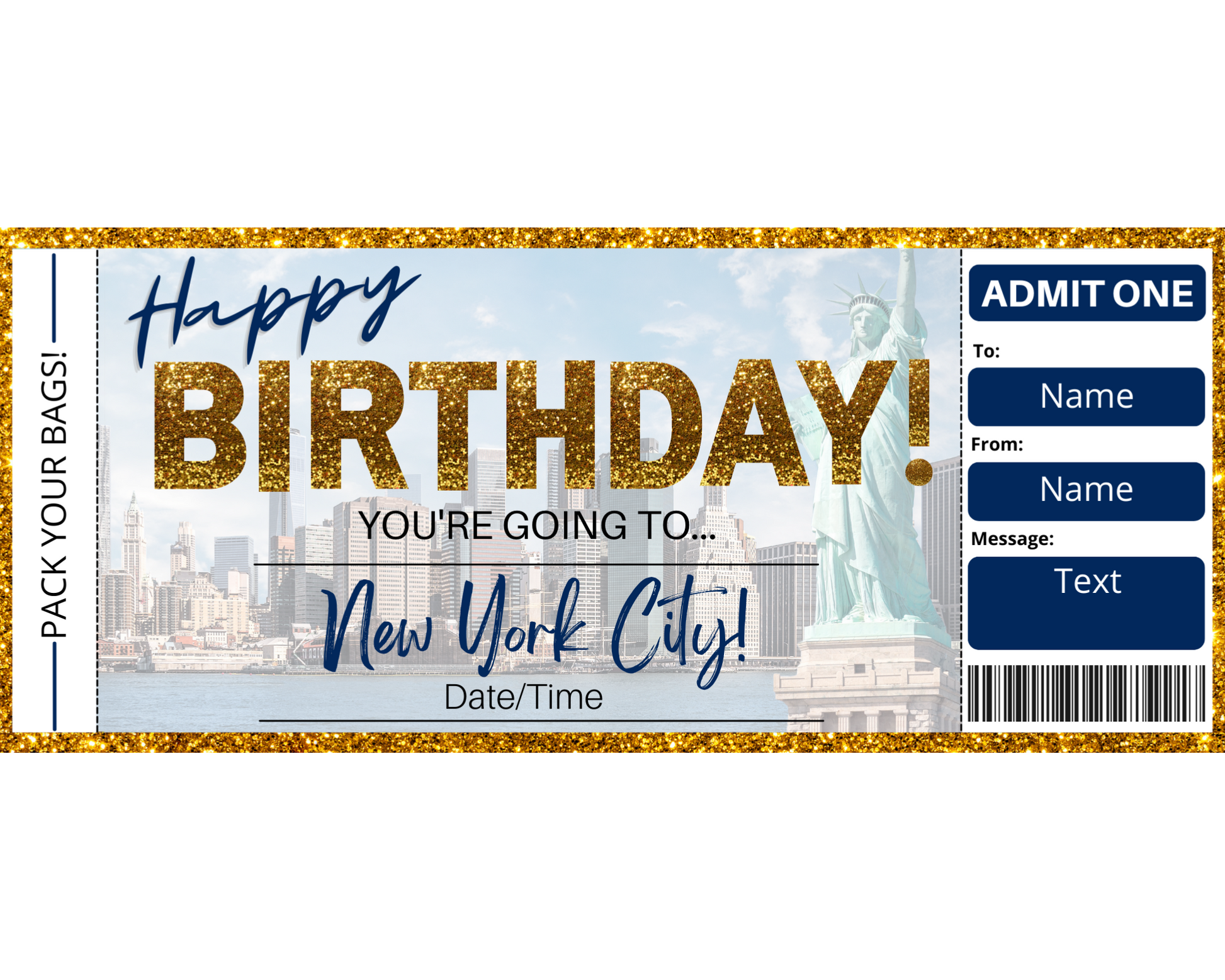 NYC boarding pass template. The perfect way to surprise someone with a trip to New York City for any occasion!