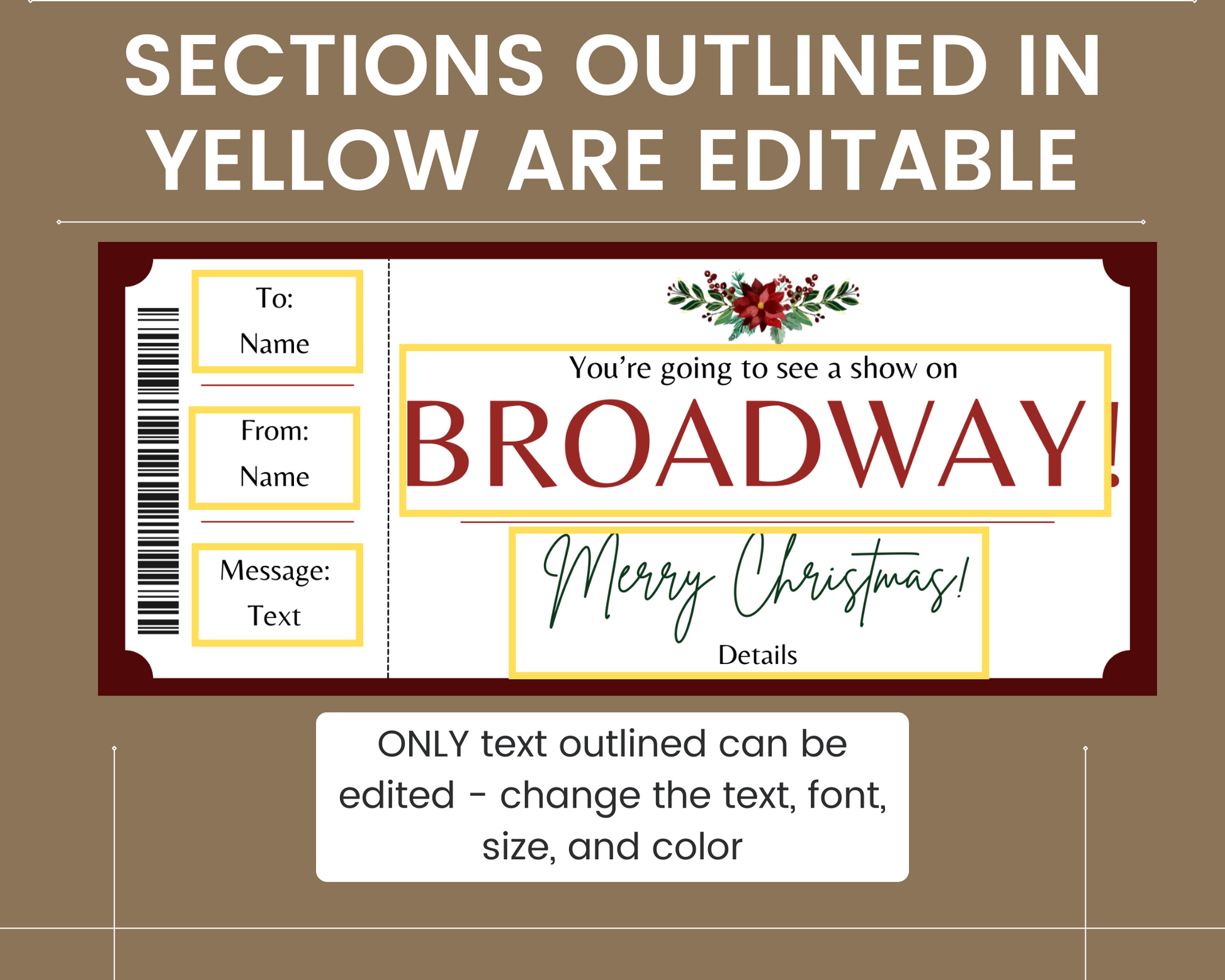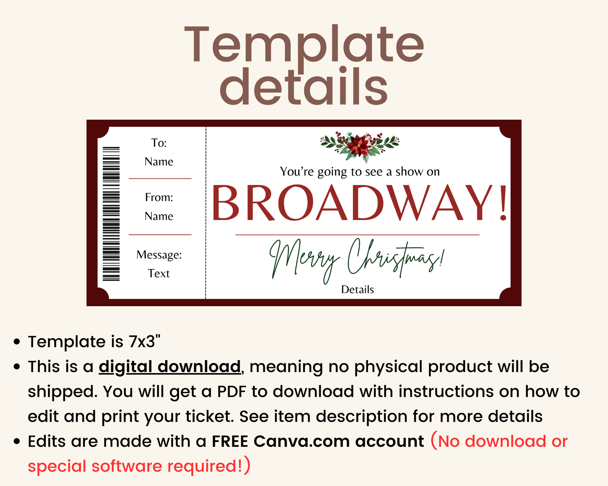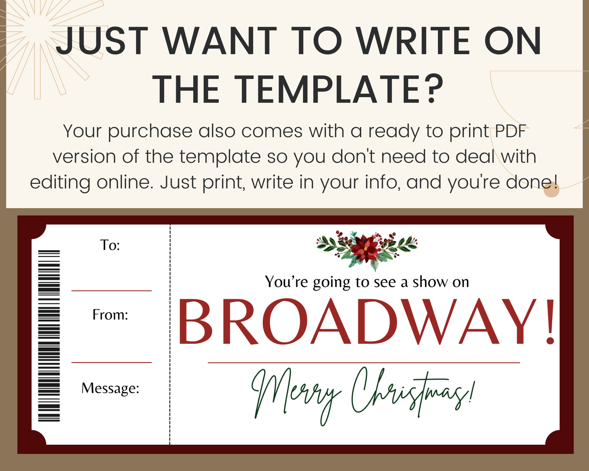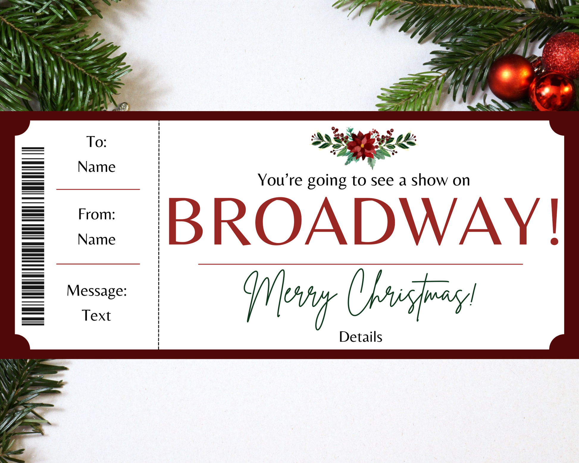 Christmas broadway show gift certificate template. The perfect way to surprise someone with broadway show tickets for Christmas!