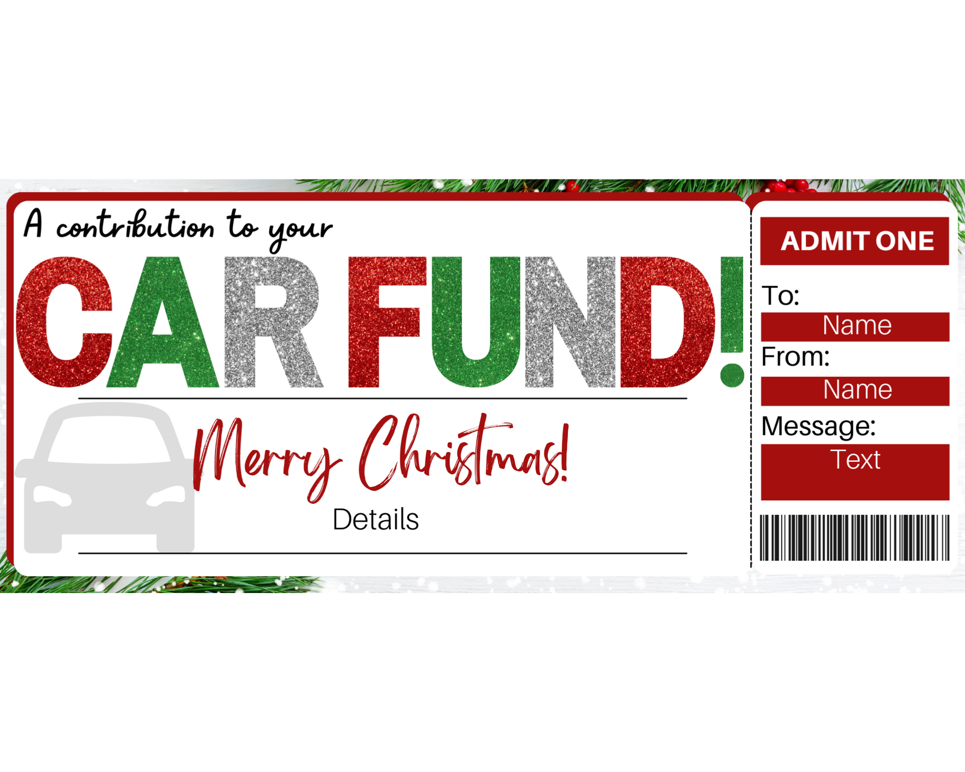 Christmas car fund gift certificate template. The perfect way to surprise someone with money for a new car for Christmas!