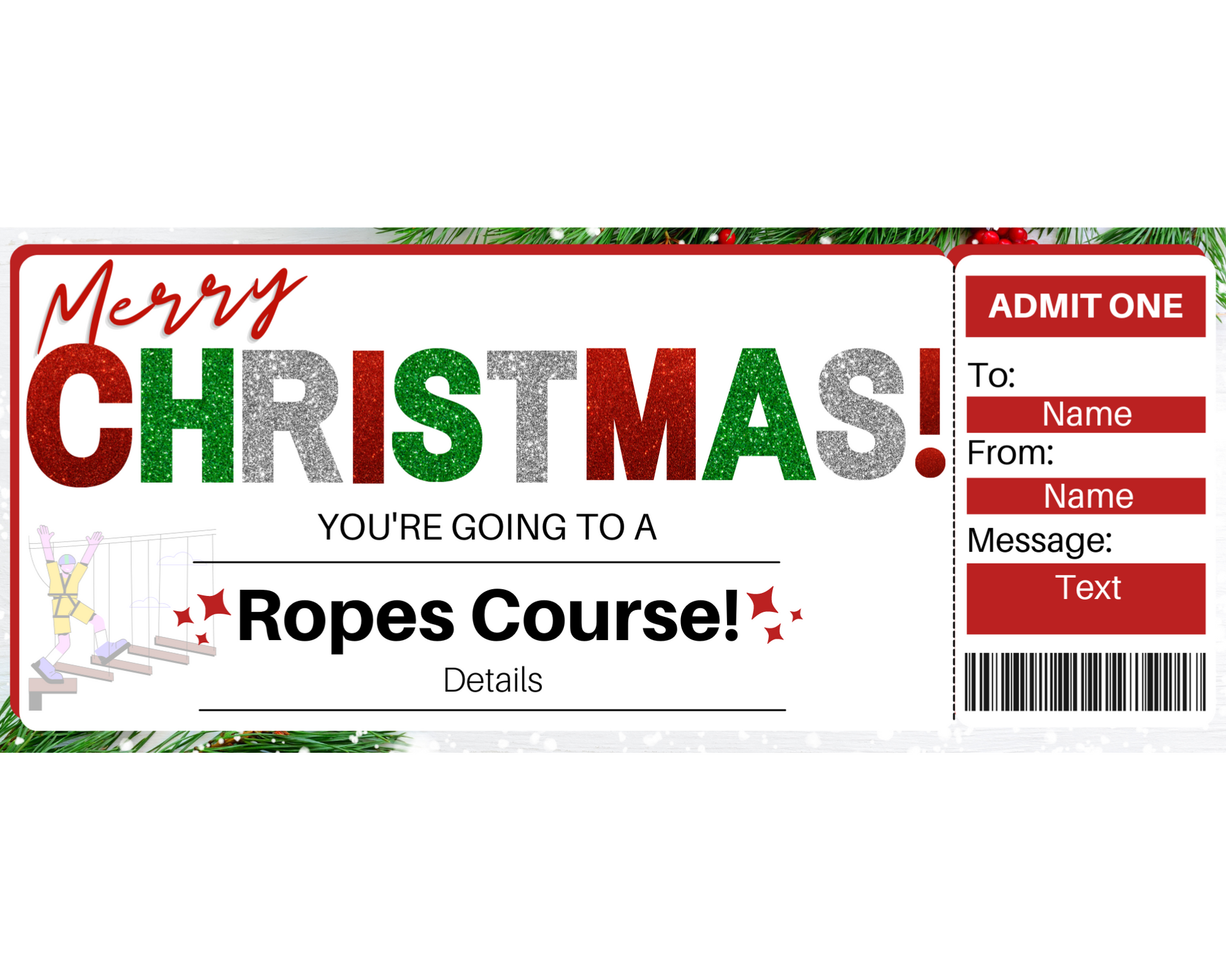 Christmas ropes course gift ticket template. The perfect way to surprise someone with a ropes course adventure for Christmas!