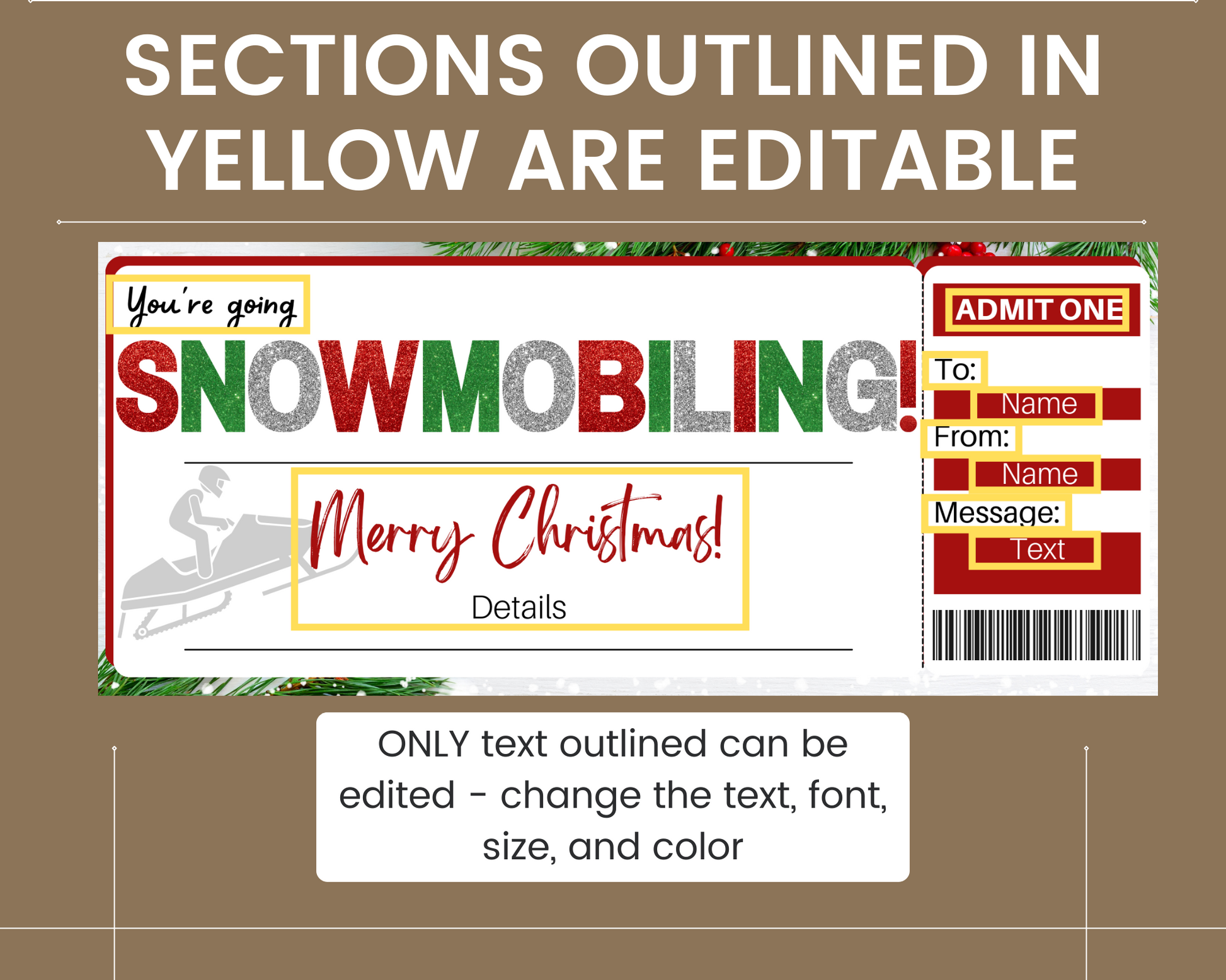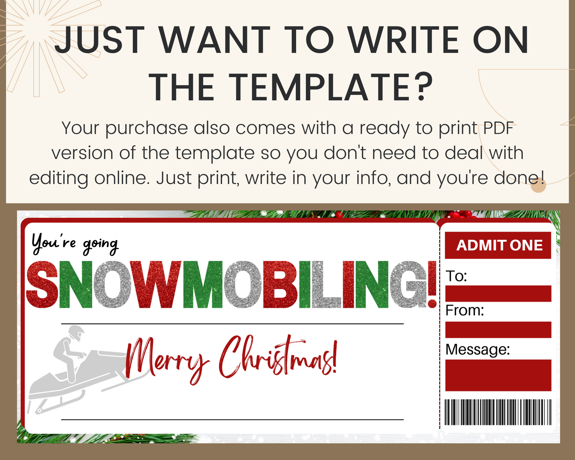 Additional details about the printable snowmobiling gift ticket template: