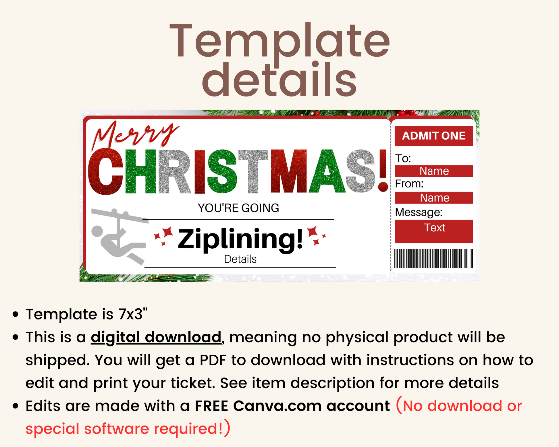 Additional details about the printable ziplining gift ticket: