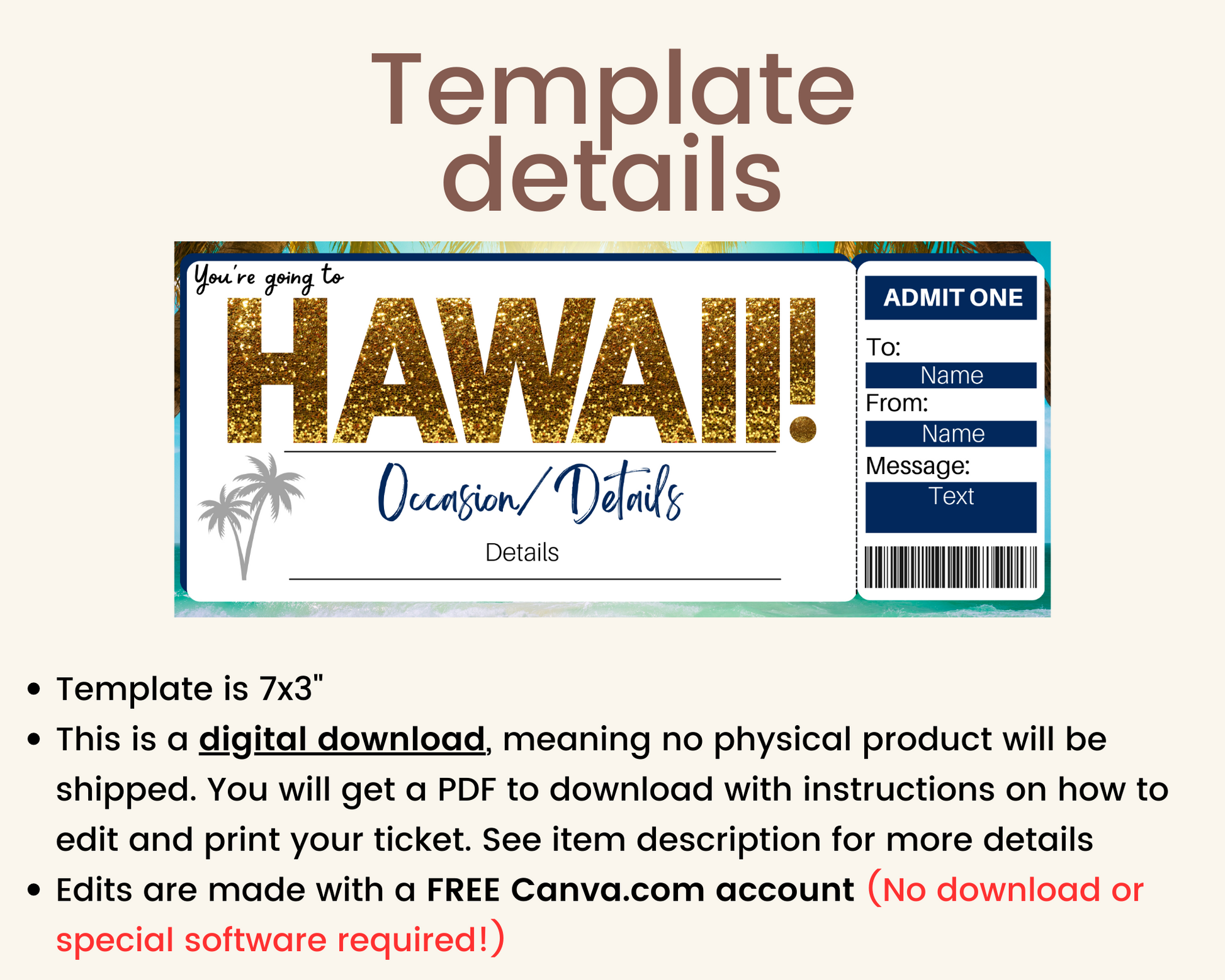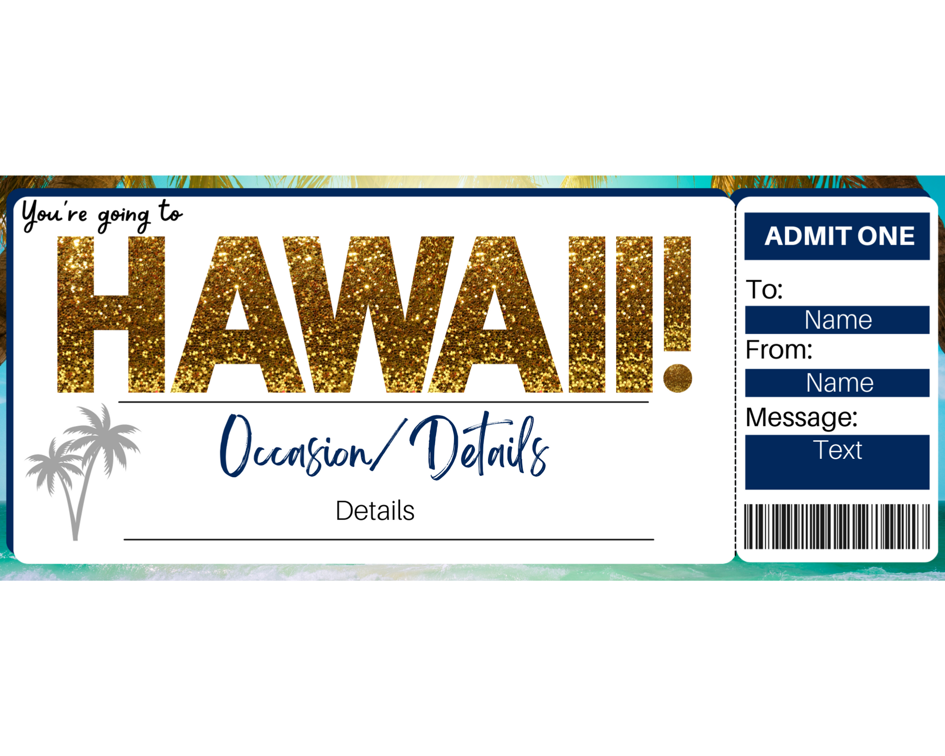 Hawaii boarding ticket template. The perfect way to surprise someone with a trip to Hawaii for any occasion!