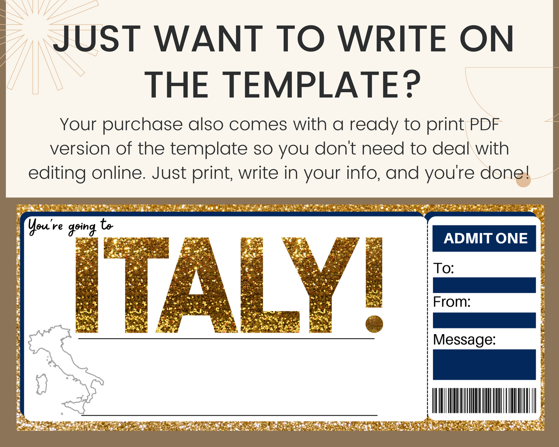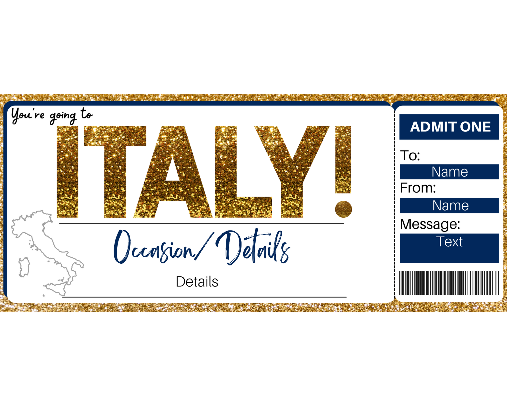 Italy flight ticket template. The perfect way to surprise someone with a trip to Italy for any occasion!