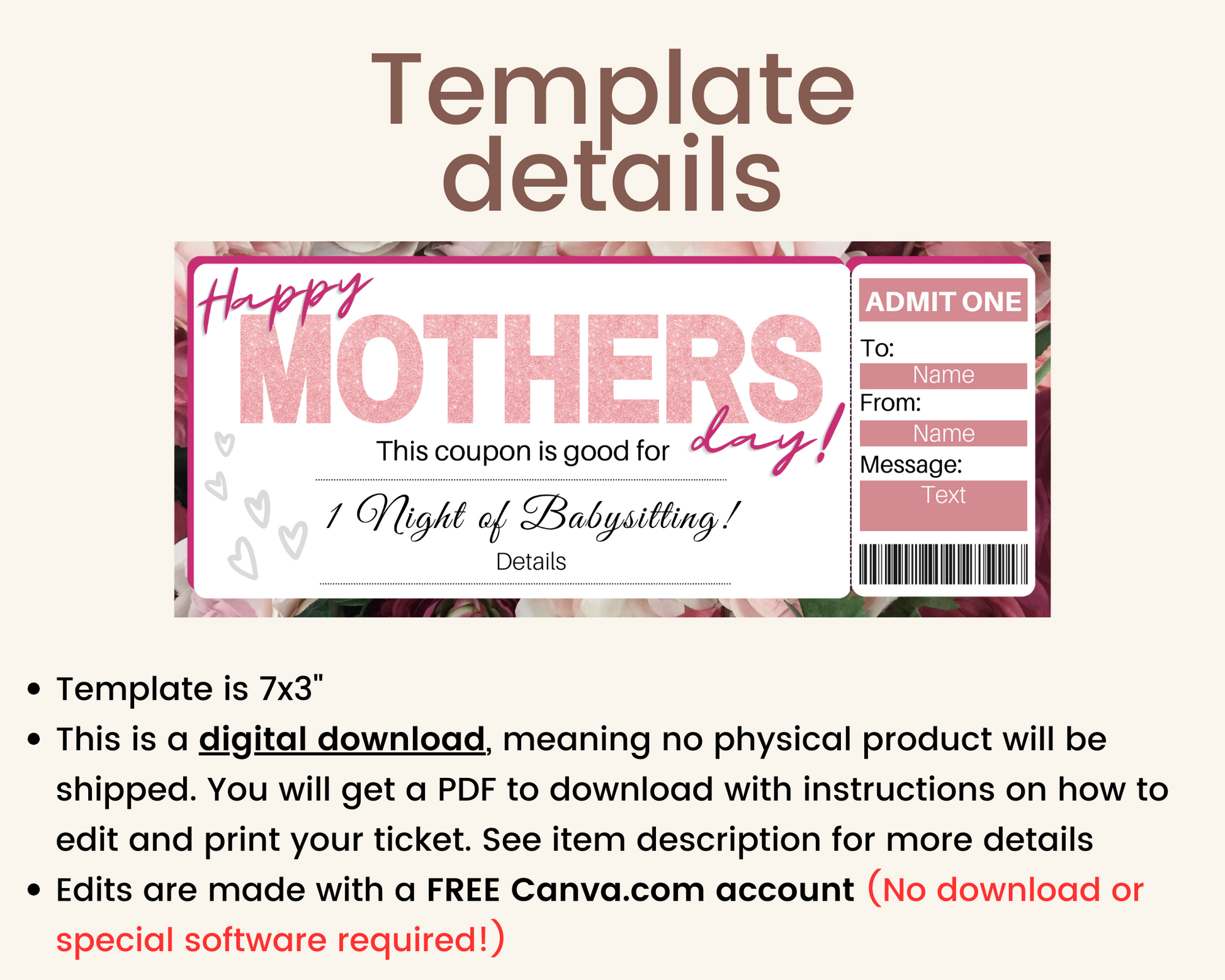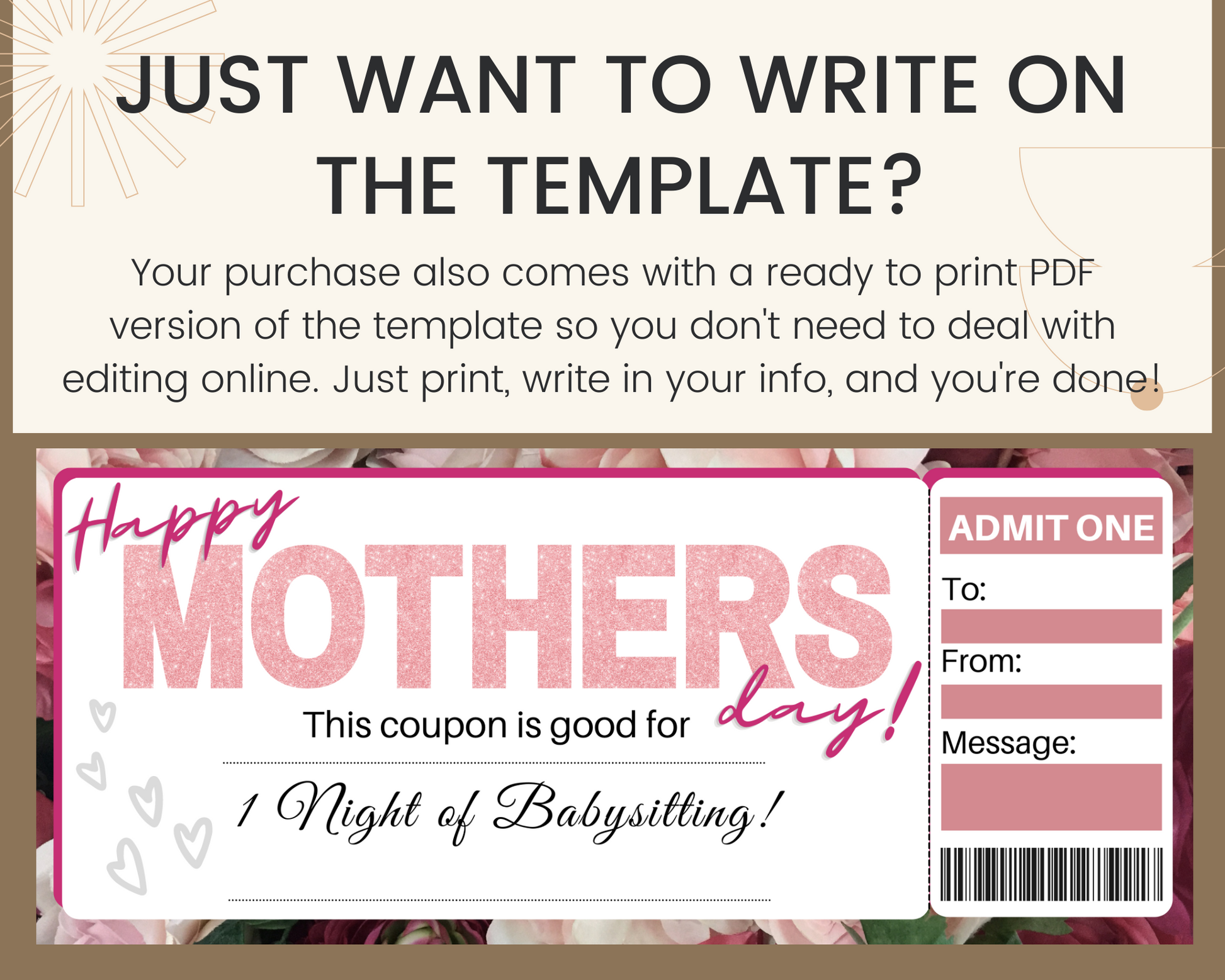 Babysitting gift ticket. The perfect way to surprise someone with a night or two of babysitting for Mother's Day!