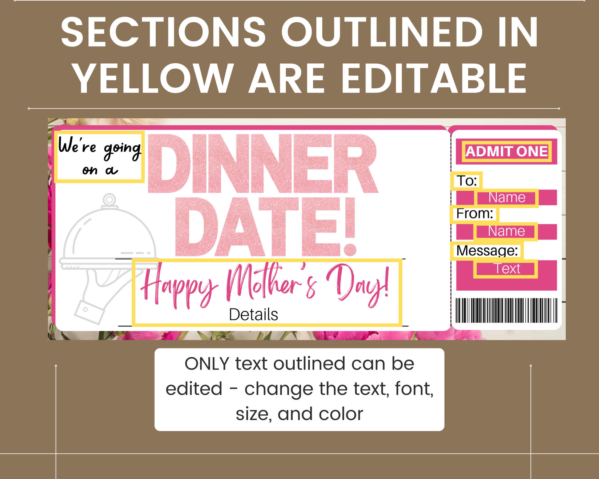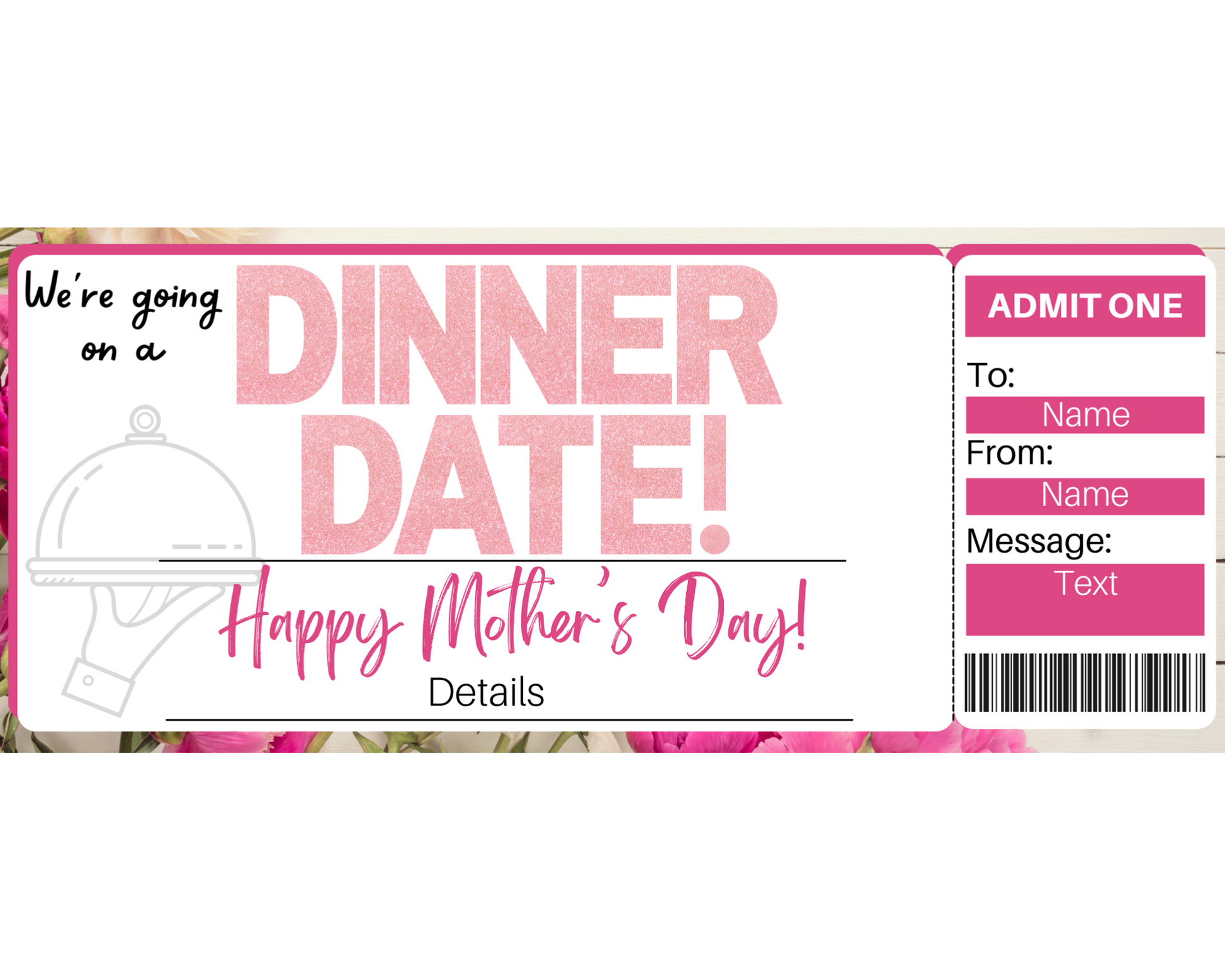 Printable dinner date ticket template. The perfect way to gift someone a dinner date for Mother's Day!