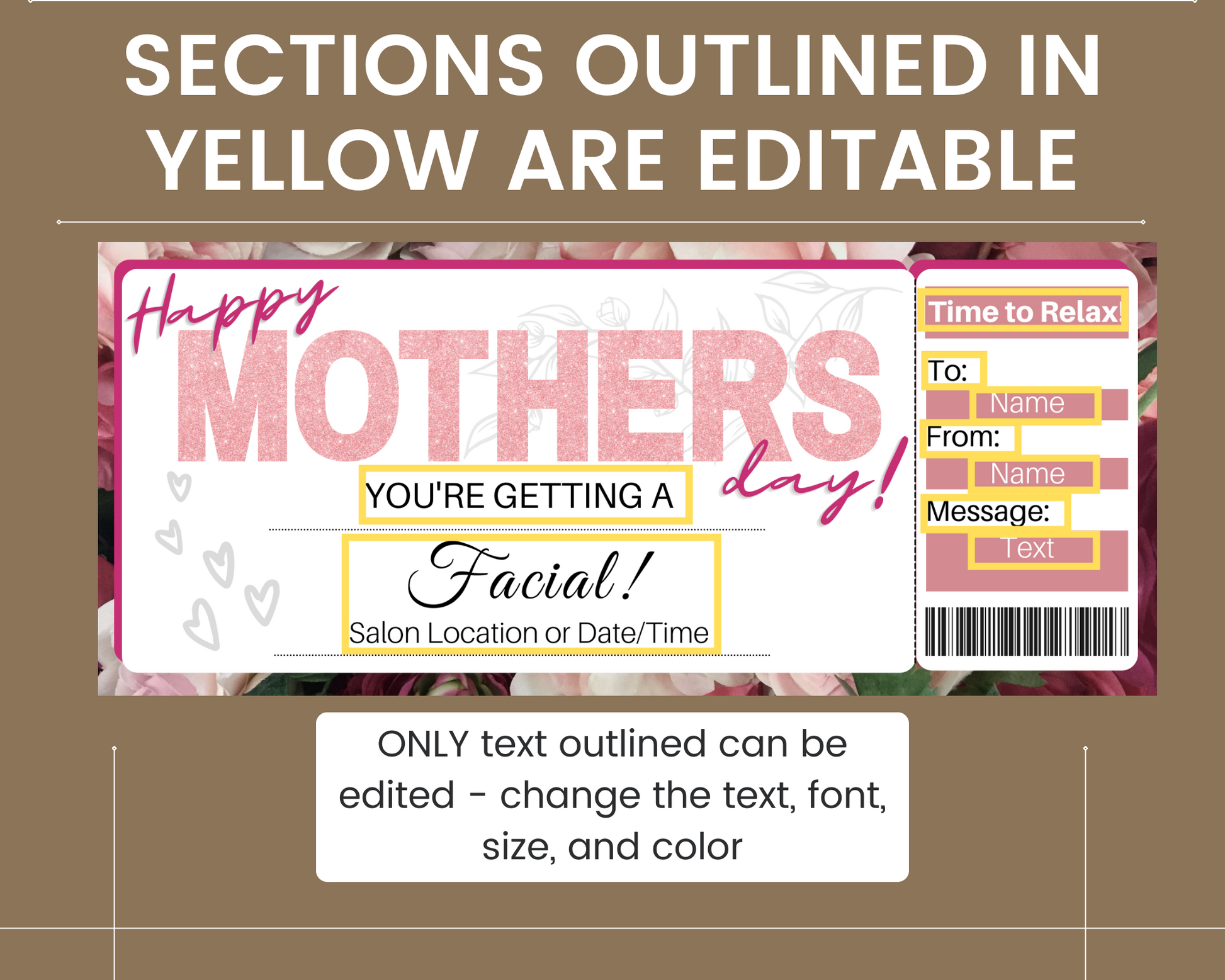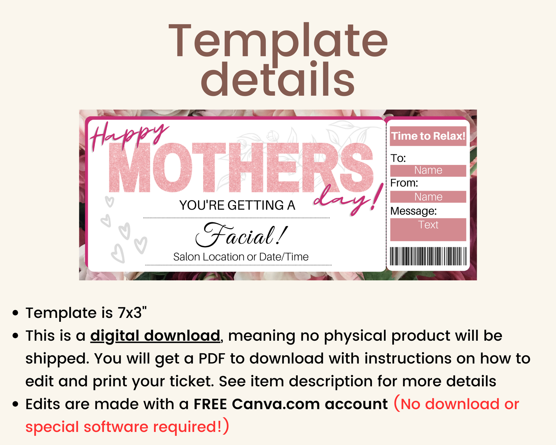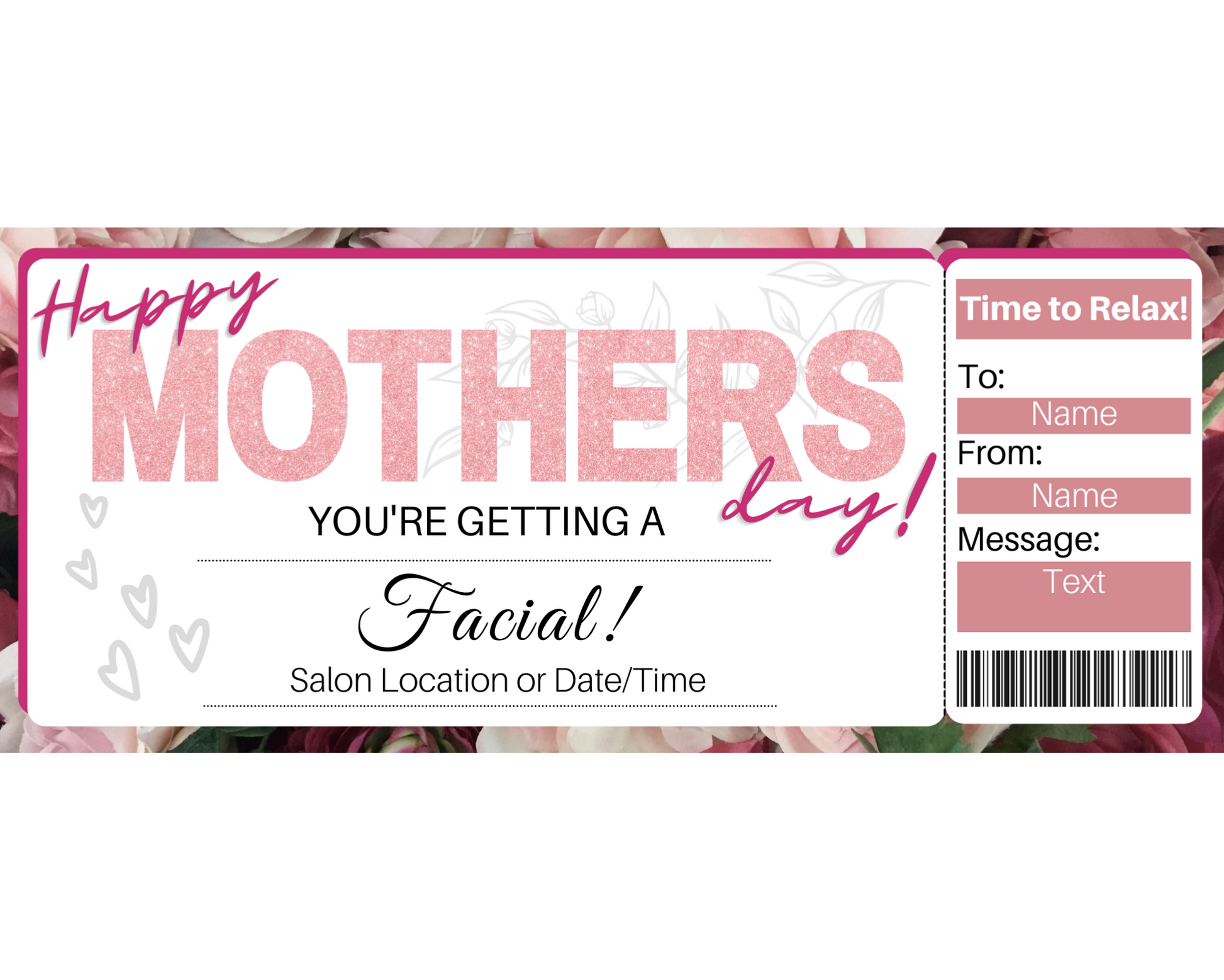 Mother's Day facial gift ticket template. The perfect way to gift mom a facial for Mother's Day!