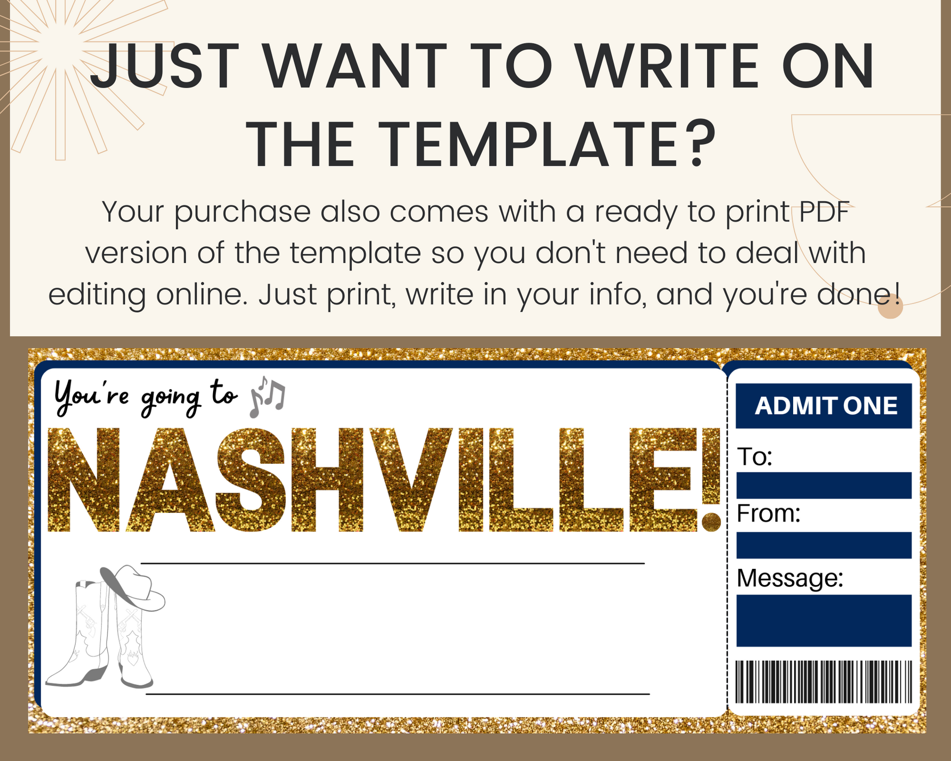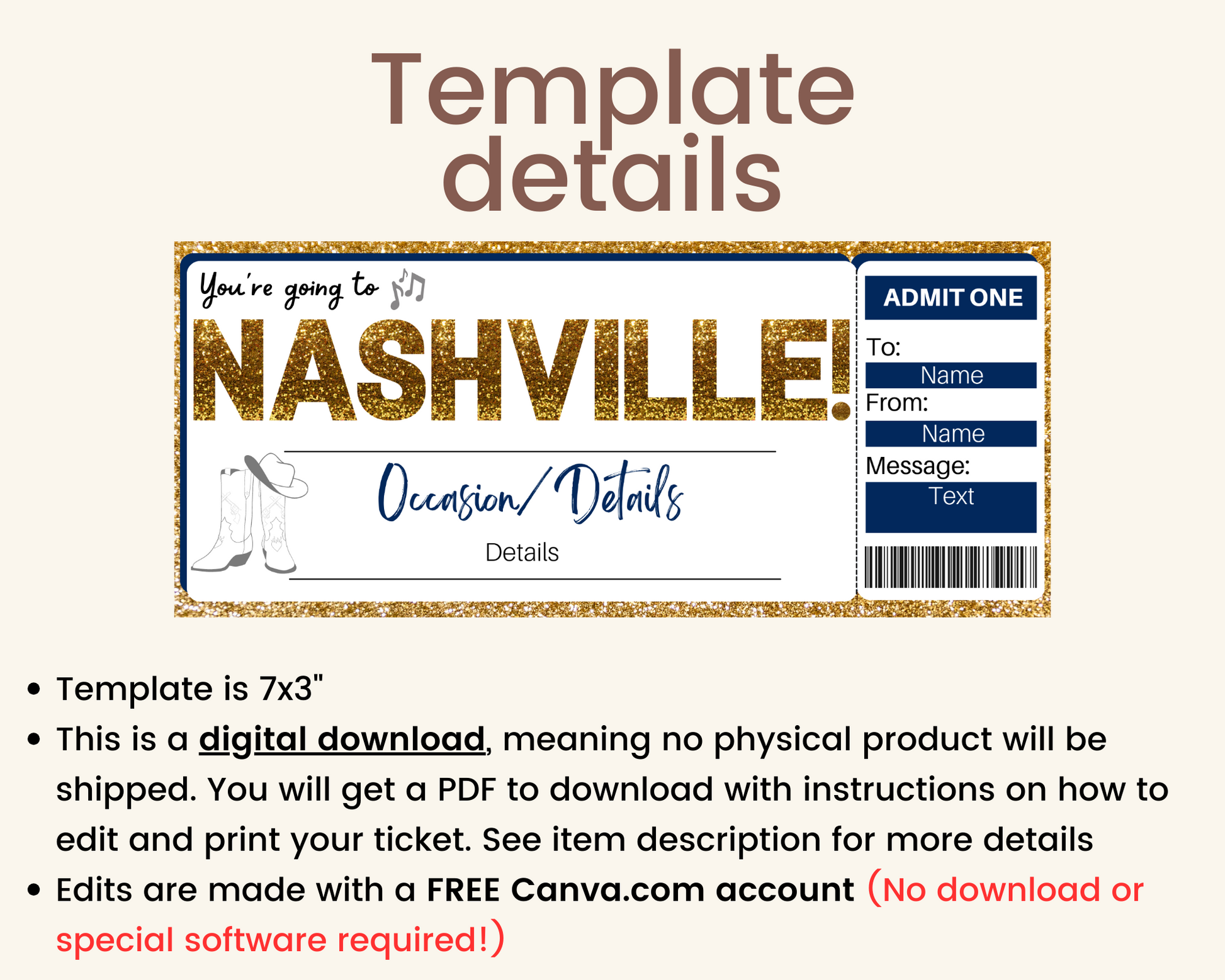 Additional details about the printable Nashville gift ticket template: