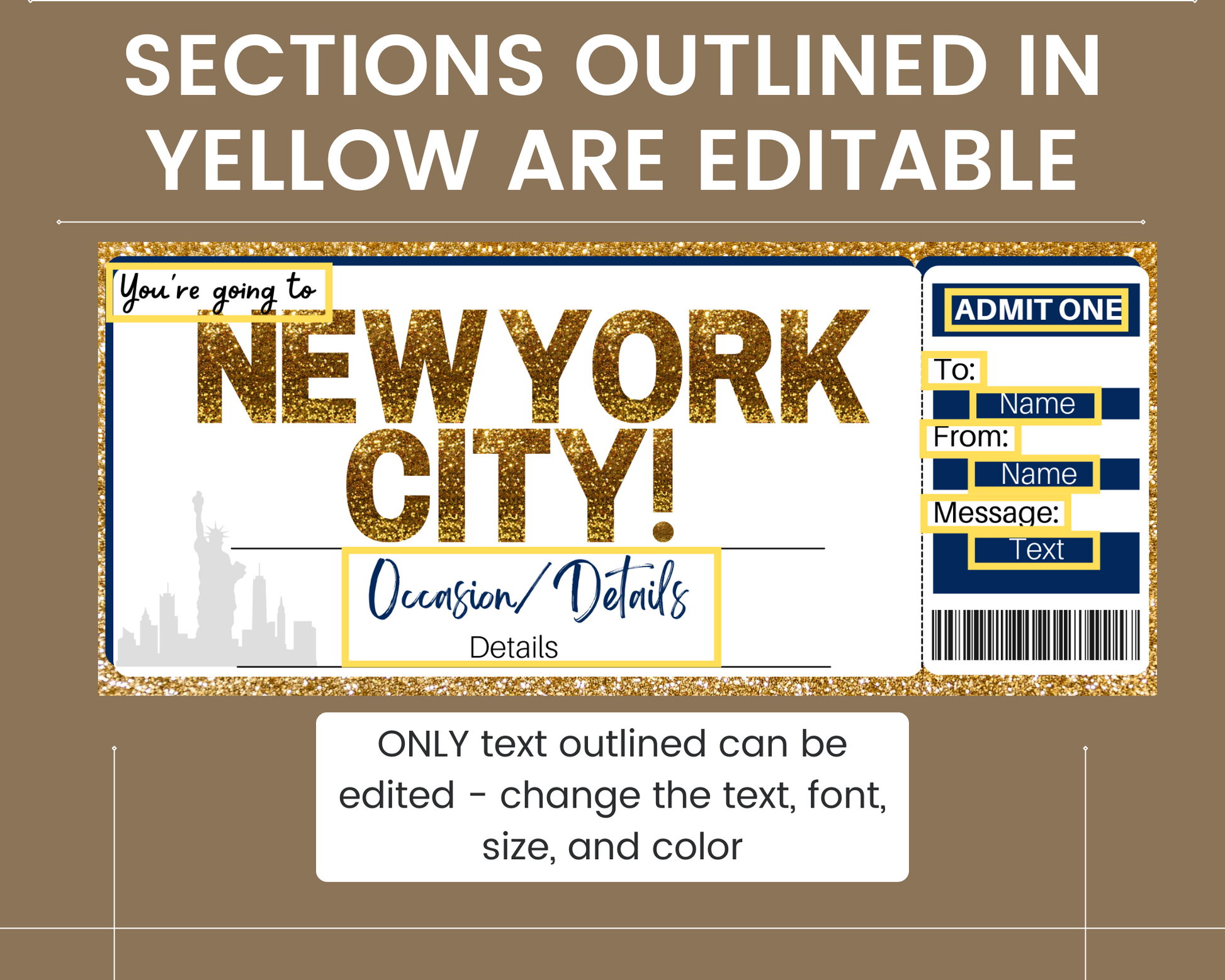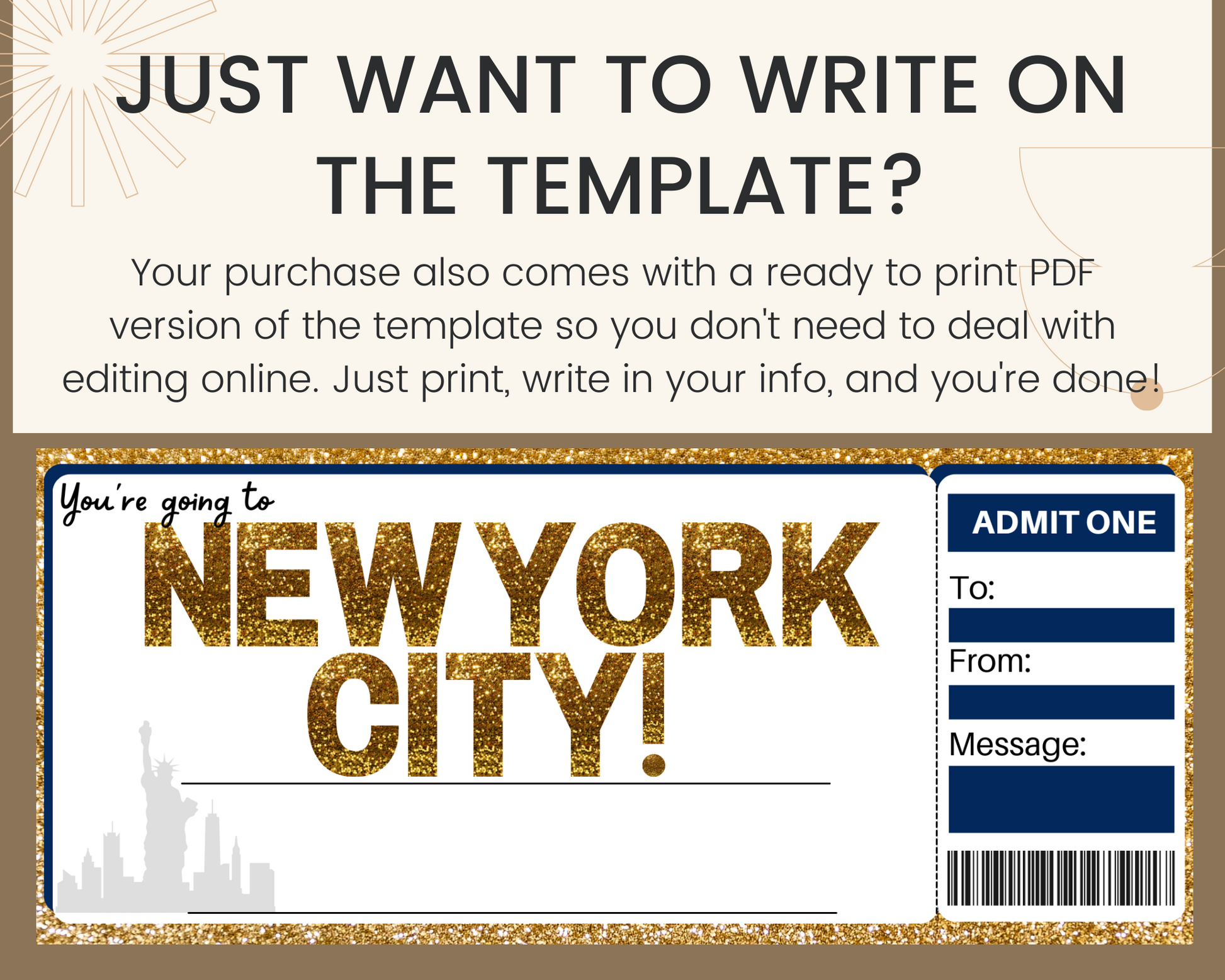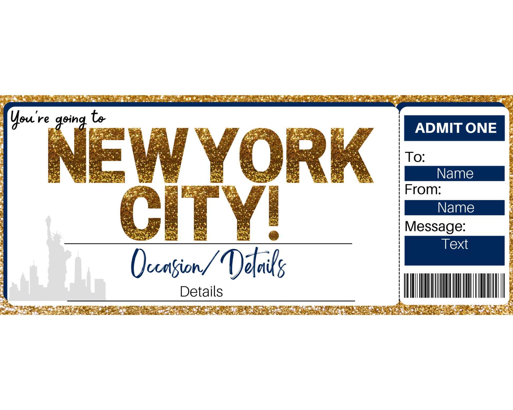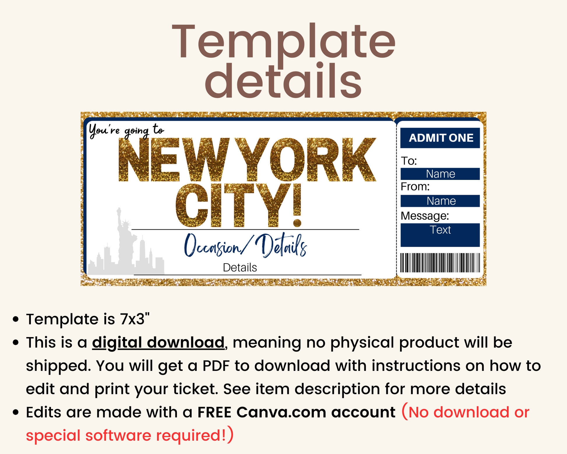 Additional details about the printable New York City gift ticket template: