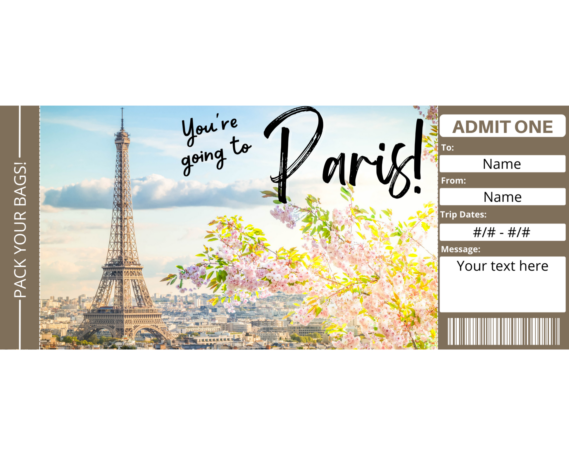 Paris boarding pass template. The perfect way to surprise someone with a trip to Paris for any occasion!