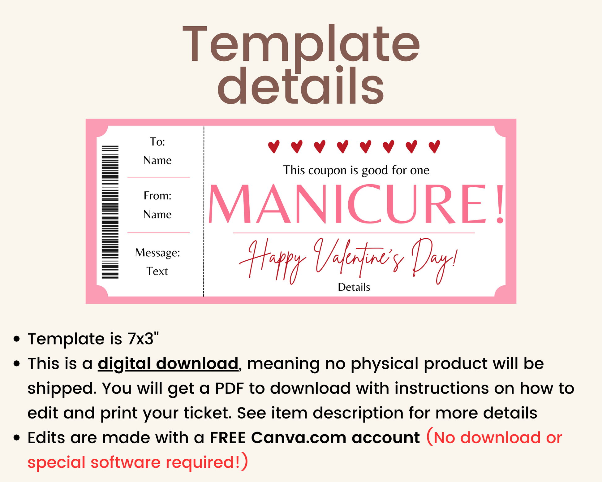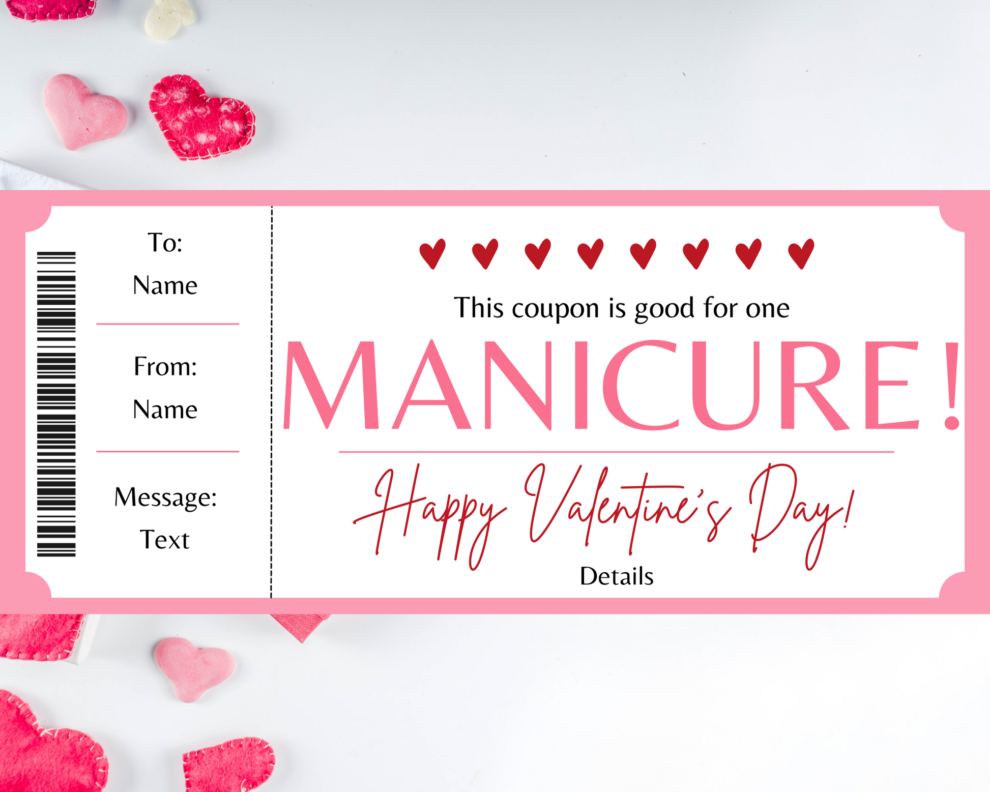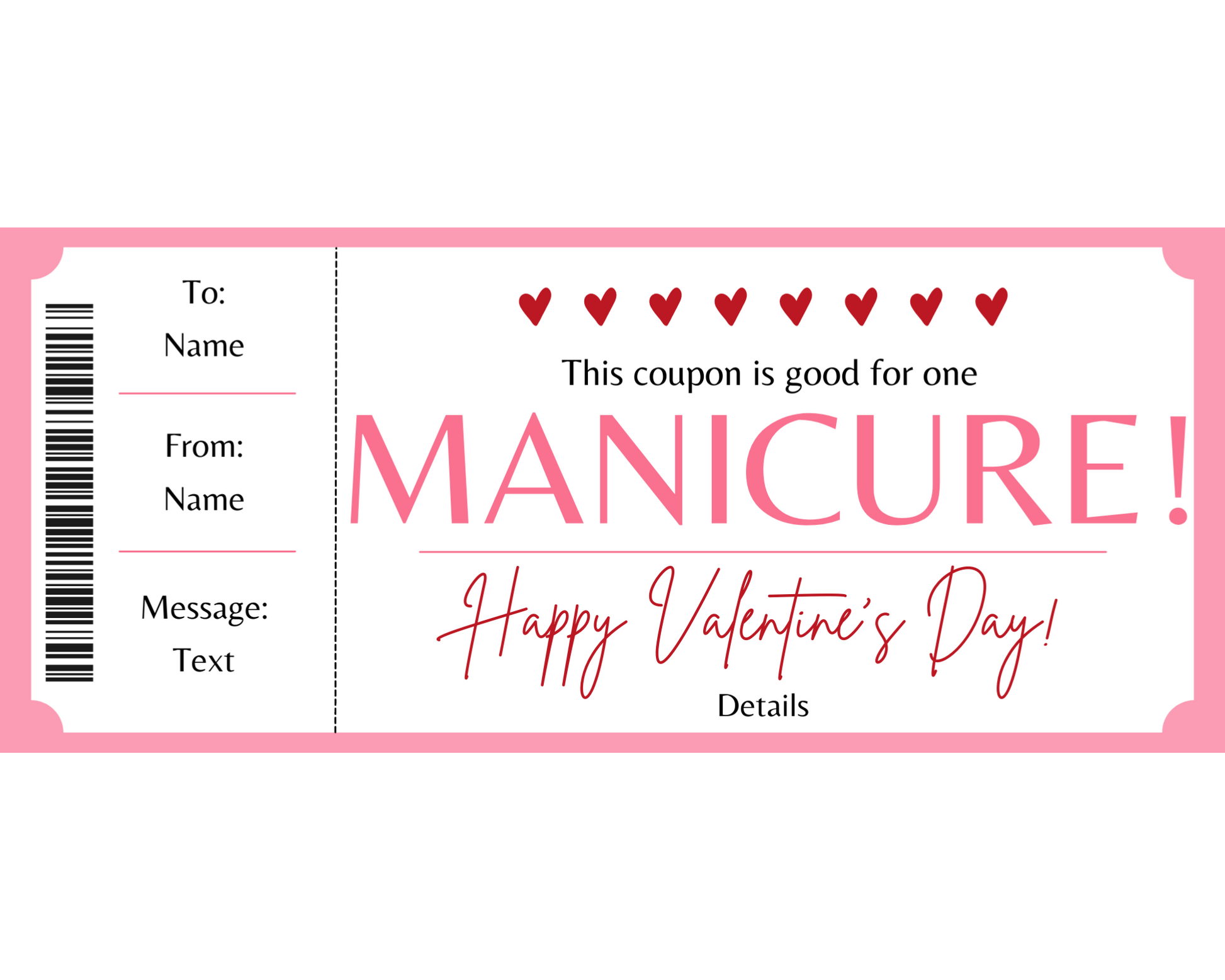 Valentine's Day manicure ticket template. The perfect way to surprise someone with a manicure for Valentine's Day!